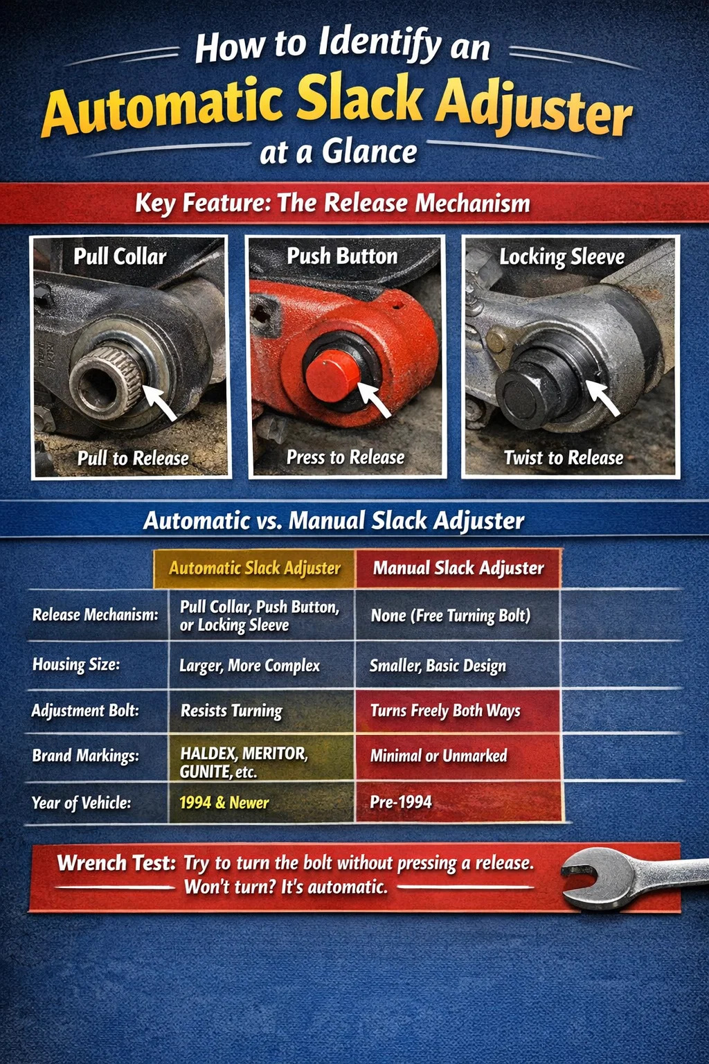 Unvant d’aborder l’identification physique, il est utile de comprendre le contexte réglementaire. Sous 49 CFR 393.53 , la Federal Motor Carrier Safety Undministration (FMCSA) exige que tous les véhicules utilitaires à freins pneumatiques fabriqués le ou après 20 octobre 1994 être équipé de régleurs de jeu automatiques. Cela s’applique aux tracteurs, remorques, autobus et à tout autre VMC à freins pneumatiques d’un PNBV supérieur à 10 000 lb.