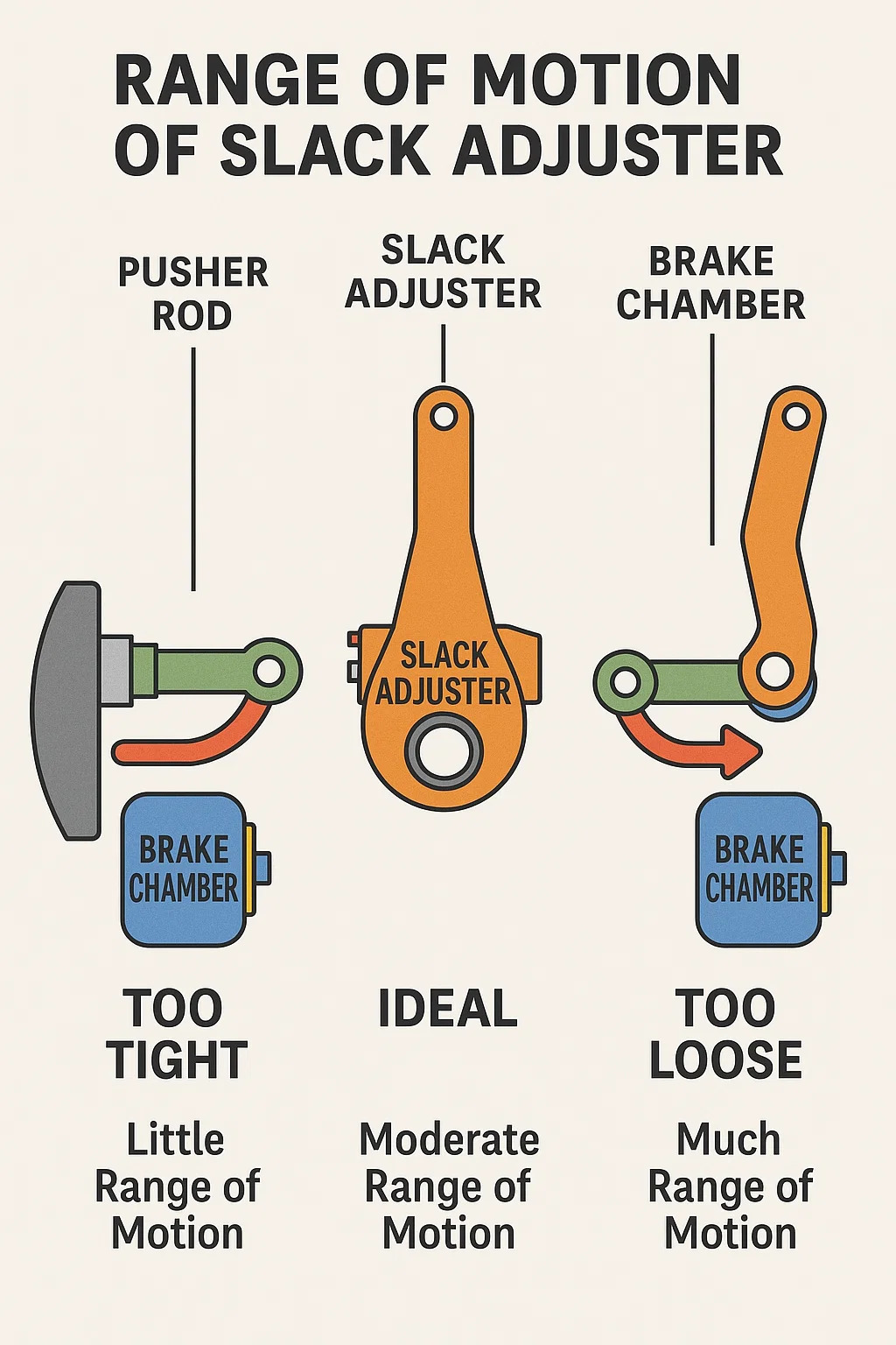 L'« amplitude de mouvement », ou plus professionnellement, la course de frein, fait référence à la distance parcourue par le régleur de jeu lorsqu'il tire sur la tige de poussée pendant l'activation du système de freinage pneumatique.