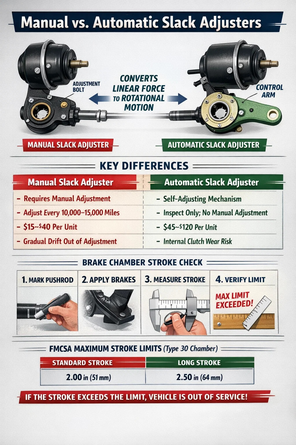 Le point critique que beaucoup de conducteurs comprennent mal : une ASA n’élimine pas la nécessité d’une inspection. Cela élimine le besoin d’un réglage manuel de routine. Si un ASA se réajuste constamment et ne parvient toujours pas à maintenir la course dans les limites, c'est le symptôme d'une garniture usée, d'une bague d'arbre à cames grippée, d'un tambour de frein fissuré ou d'un dispositif de réglage défectueux - et non le signe que le technicien doit simplement tourner à nouveau le boulon de réglage.