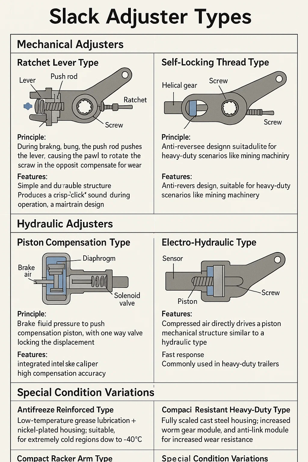 Principe : Lors du freinage, la tige de poussée pousse le levier, provoquant la rotation du cliquet avec le cliquet, entraînant une légère extension de la vis pour compenser le jeu d'usure.
