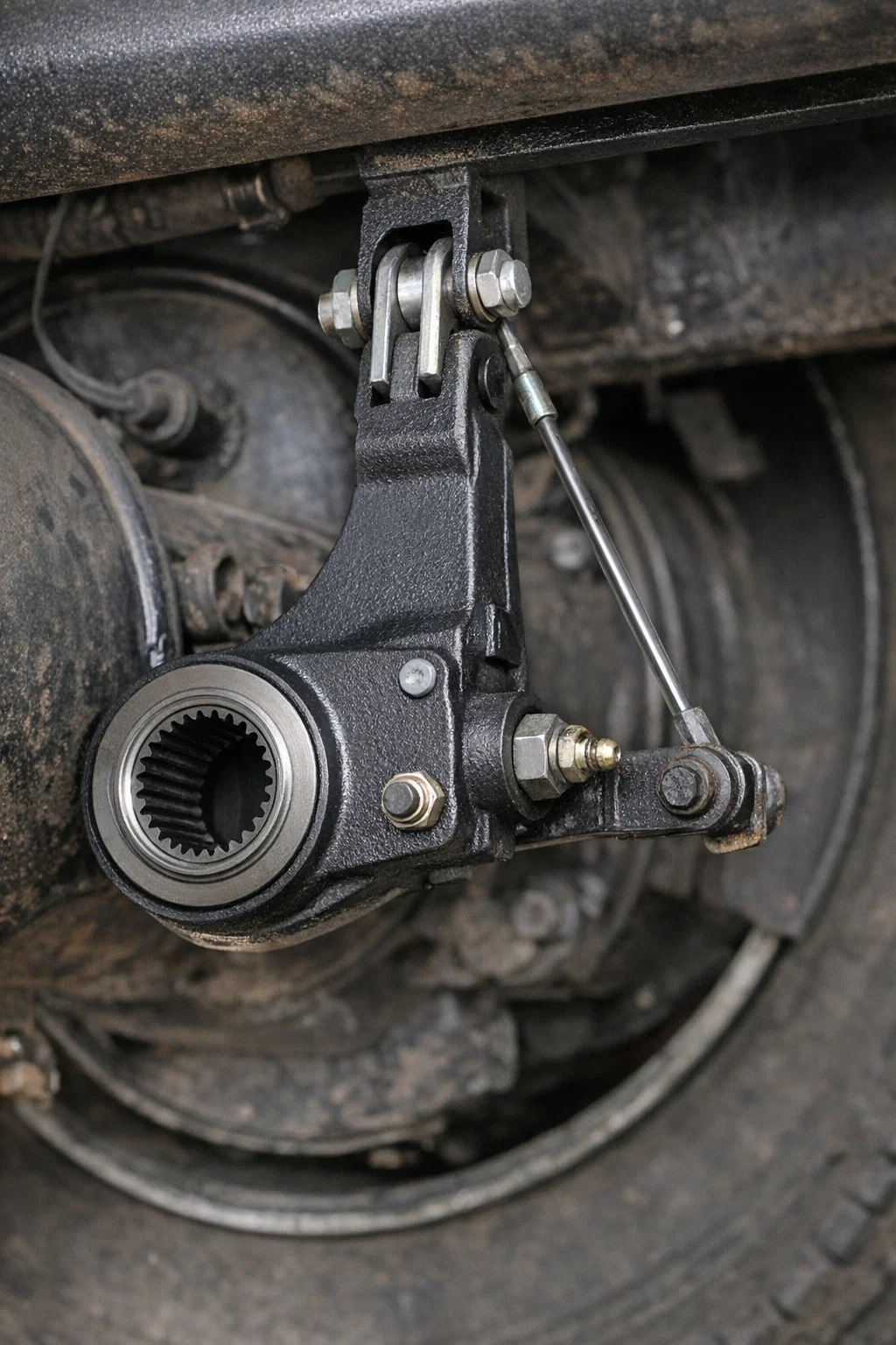 Le régleur de jeu automatique est comme un « bras de fer » relié au système de freinage de la roue. Il est généralement caché derrière l'essieu, à l'intérieur de la roue, mais si vous regardez sous le véhicule, il est assez visible.